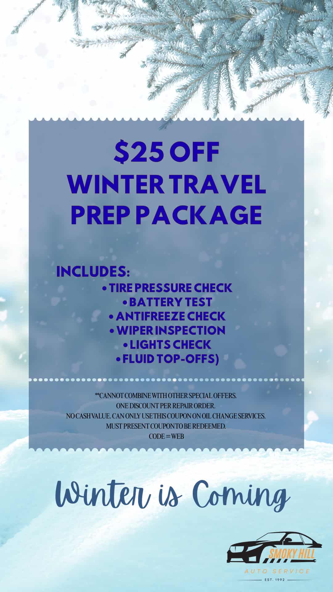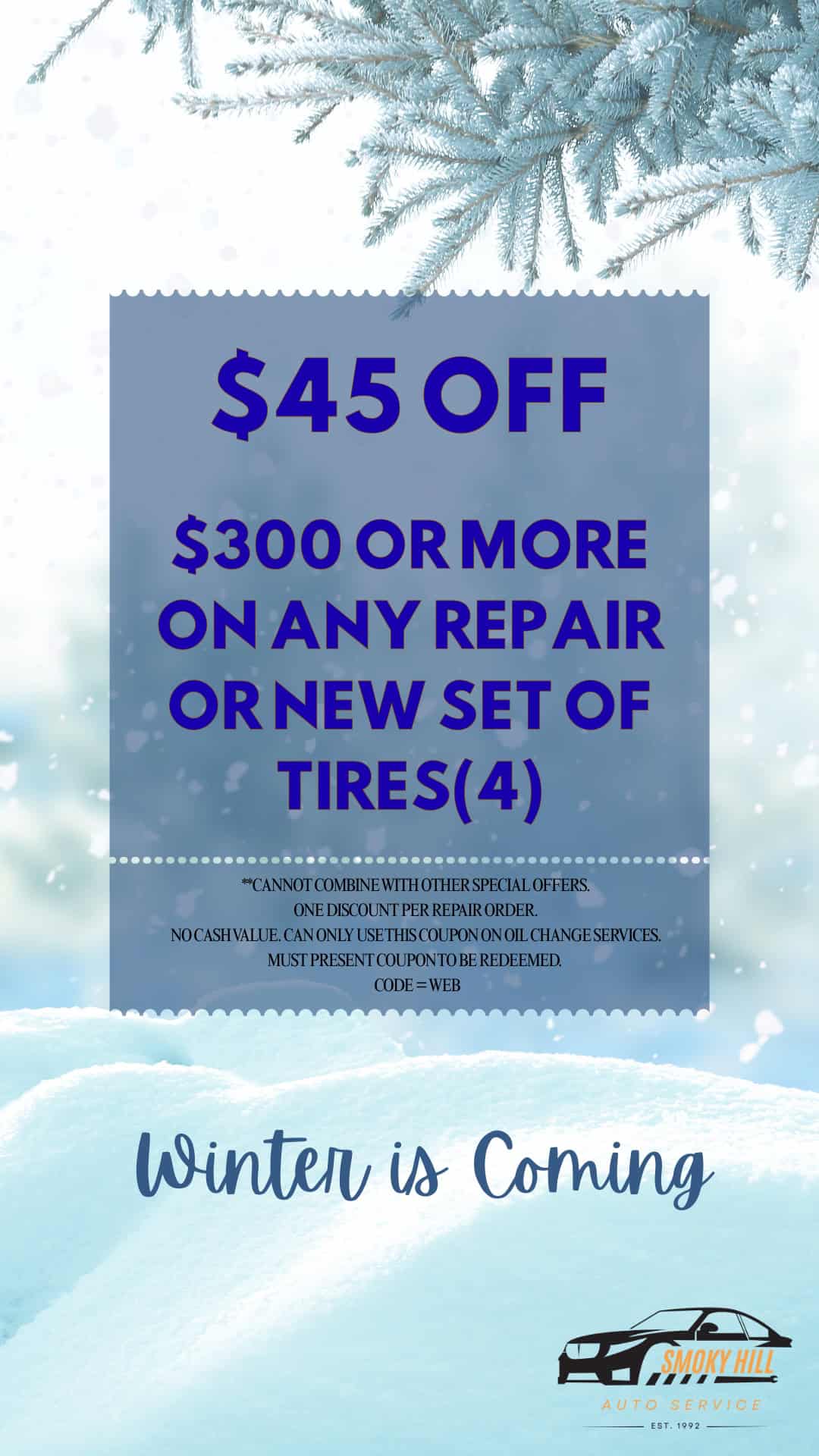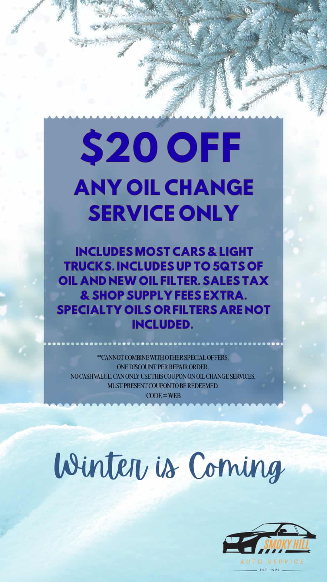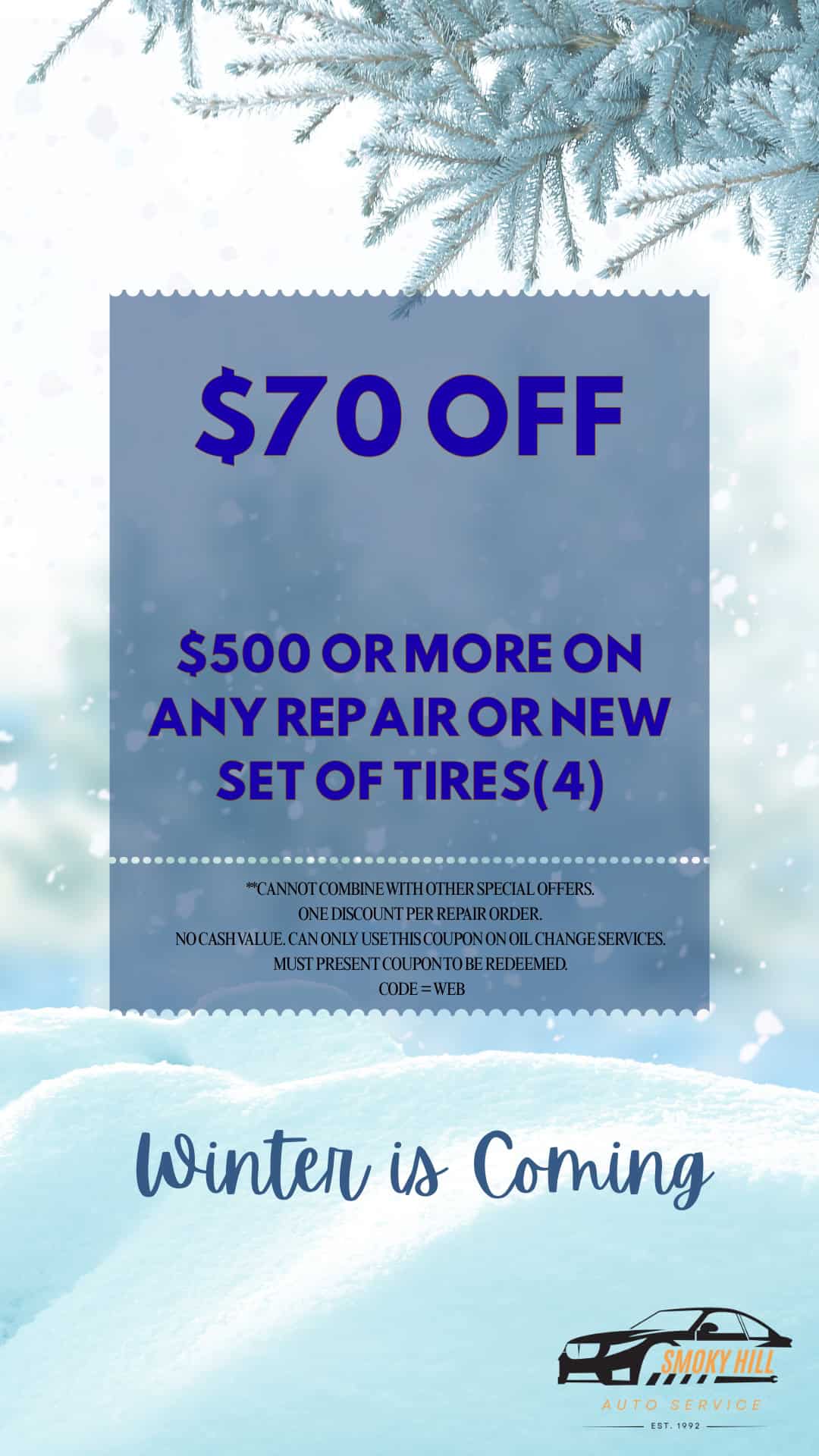 At Smoky Hill Auto, our Winter Specials are designed to keep your ride safe, warm, and dependable all season long: