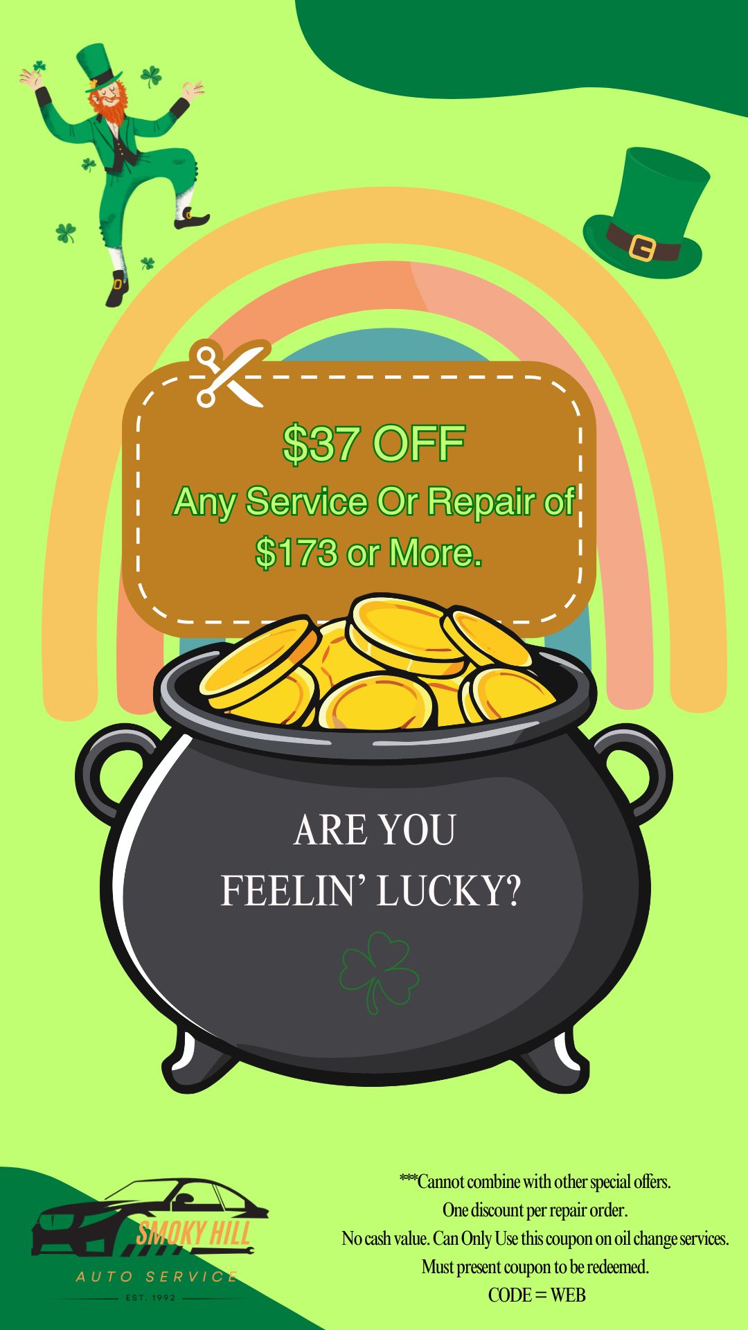 No cash value. One coupon per repair order, cannot combine with other offers. Shop supplies and Sales taxes extra. Must show coupon at counter to be redeemed. Use Code WEB. Call store for more details. 303-766-9227